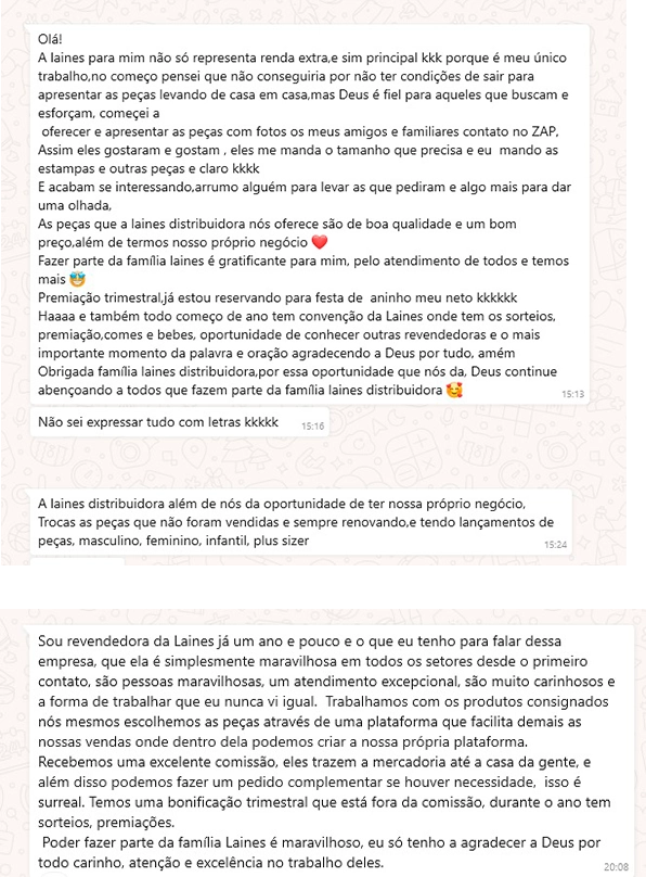 Ao ingressar na Laines, você passa a fazer parte de uma comunidade de Revendedoras que compartilham experiências, dicas e apoio mútuo, enriquecendo sua jornada empreendedora.