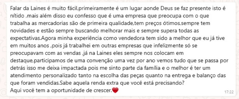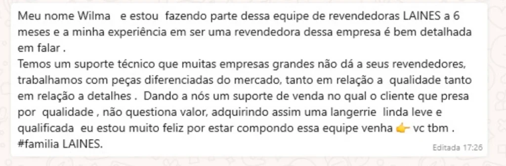 A Laines oferece suporte contínuo às suas Revendedoras, proporcionando treinamentos e materiais que auxiliam no desenvolvimento e crescimento do negócio.